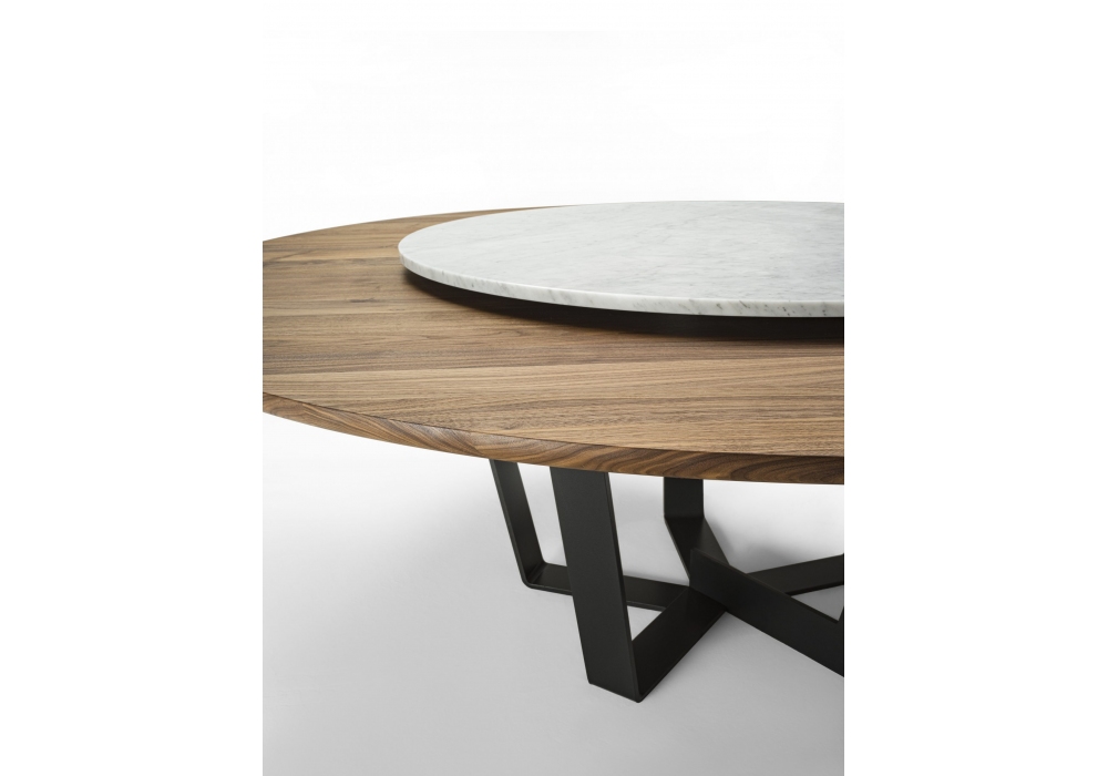 Kohi Table conçue par Terry Dwan pour Riva 1920 est une table ronde réalisée avec un plateau en bois massif avec l'ajout d'un plateau de support en bois ou en marbre, équipée d'un système pivotant Lazy Susan. Caractérisé par une base radiale en fer. Disponible en différentes finitions et dimensions.