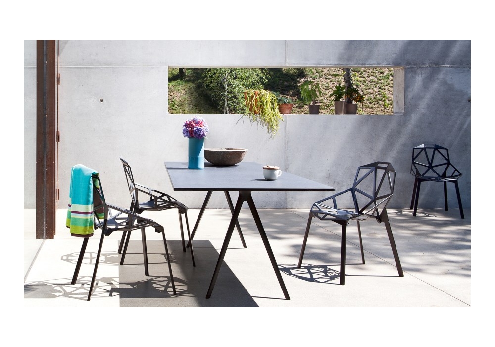 Baguette conçue par Ronan & Erwan Bouroullec pour Magis est une table avec pieds en aluminium moulé sous pression poli ou peint en polyester, traverse en profilé d'aluminium extrudé poli ou peint en polyester. Disponible en différentes finitions et tailles.