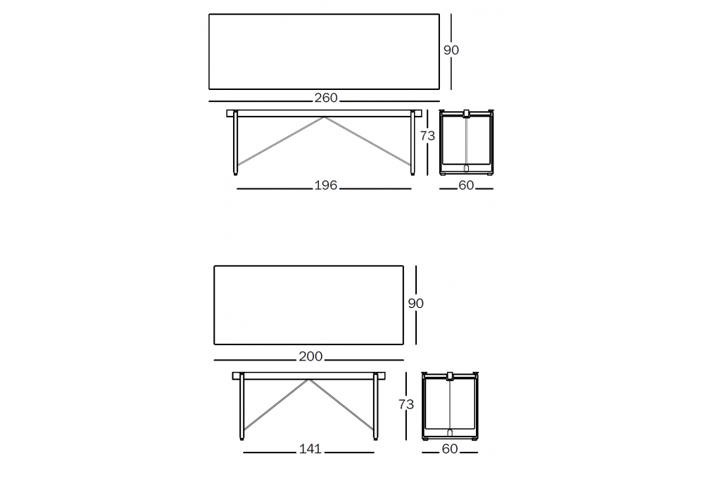 | Dimensions | 200 x 92 x H 73 cm; 260 x 90 x H 73 cm. |