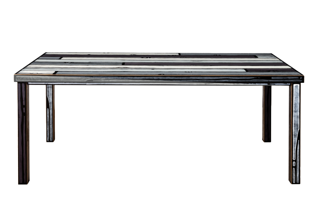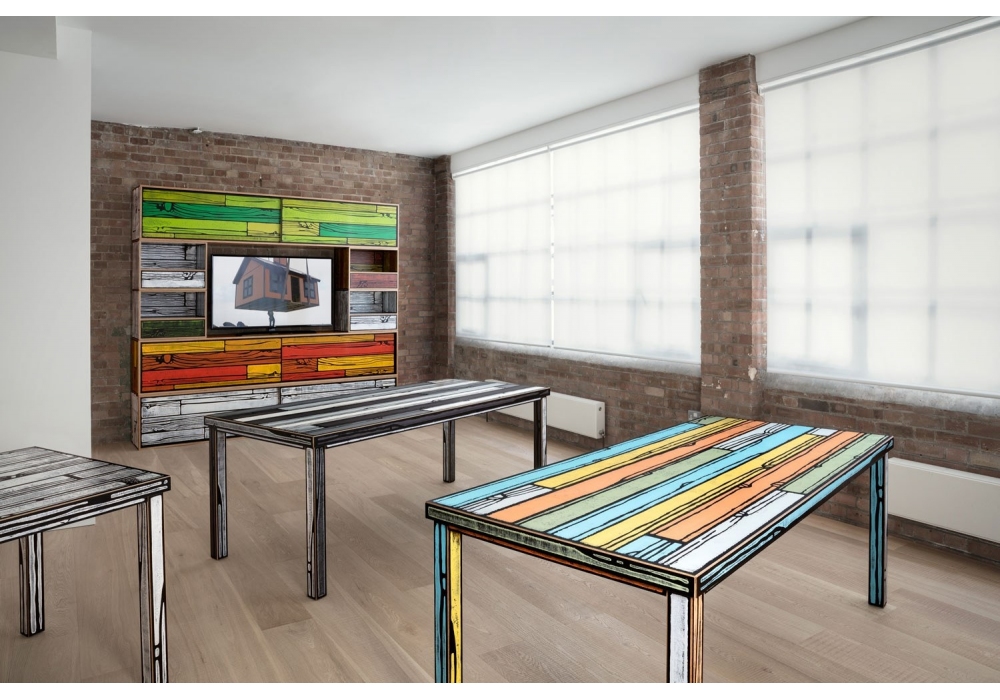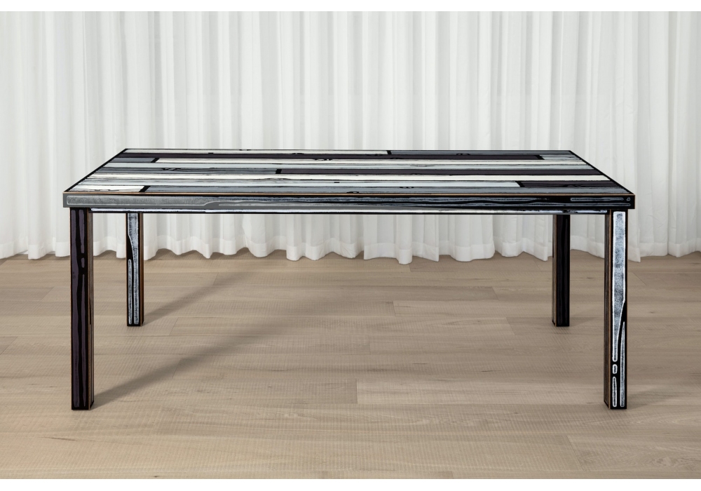 Wrongwoods conçue par Richard Woods & Sebastian Wrong pour Established & Sons est une table en bois avec des gravures sur le grain du bois.