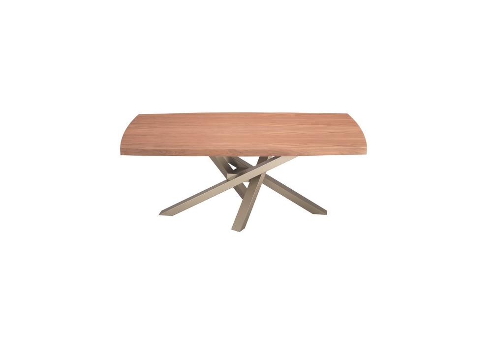 Shangai conçue par Riflessi est une table avec plateau en bois de 50 mm d'épaisseur. avec bords irréguliers en noyer canaletto ou chêne. Base en aluminium recouvert d'acier inoxydable miroir, peint, recouvert de grès Rivergrey ou ArabiK, ou recouvert de noyer Canaletto ou de chêne. Disponible en différentes dimensions.