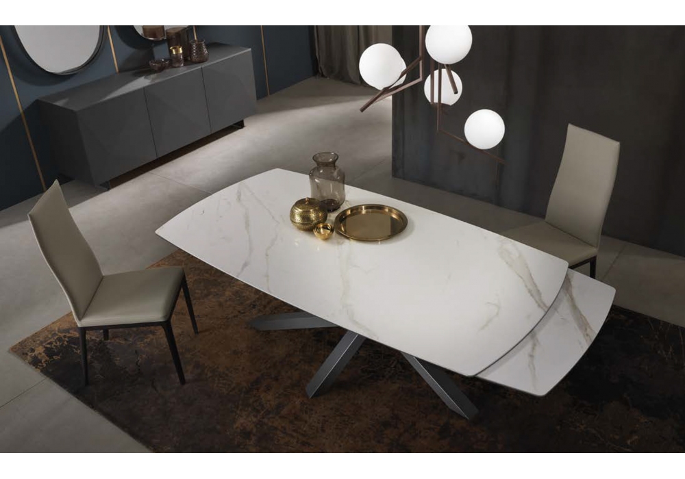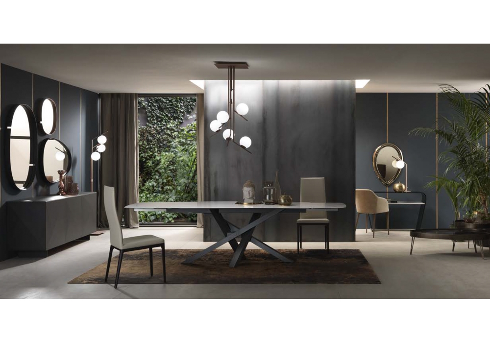 Shangai conçue par Riflessi est une table extensible avec plateau en céramique biseauté en couches sur verre. Base en aluminium recouvert d'acier inoxydable miroir ou peint. Disponible en différentes dimensions.