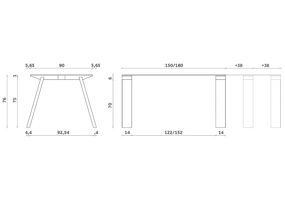 | Dimensions | • 150 x 90 x H 76 cm; • 180 x 90 x H 76 cm; • 150-190-230 x 90 x H 76 cm; • 180-220-260 x 90 x H 76 cm |