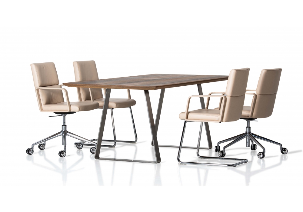 DS-790 conçue par de Sede Design Team pour De Sede est une table avec plateau en chêne des marais avec bord suisse en bois massif, guides recouverts de noir mat et structure en acier inoxydable poli sablé ou peint. Disponible en différentes dimensions.