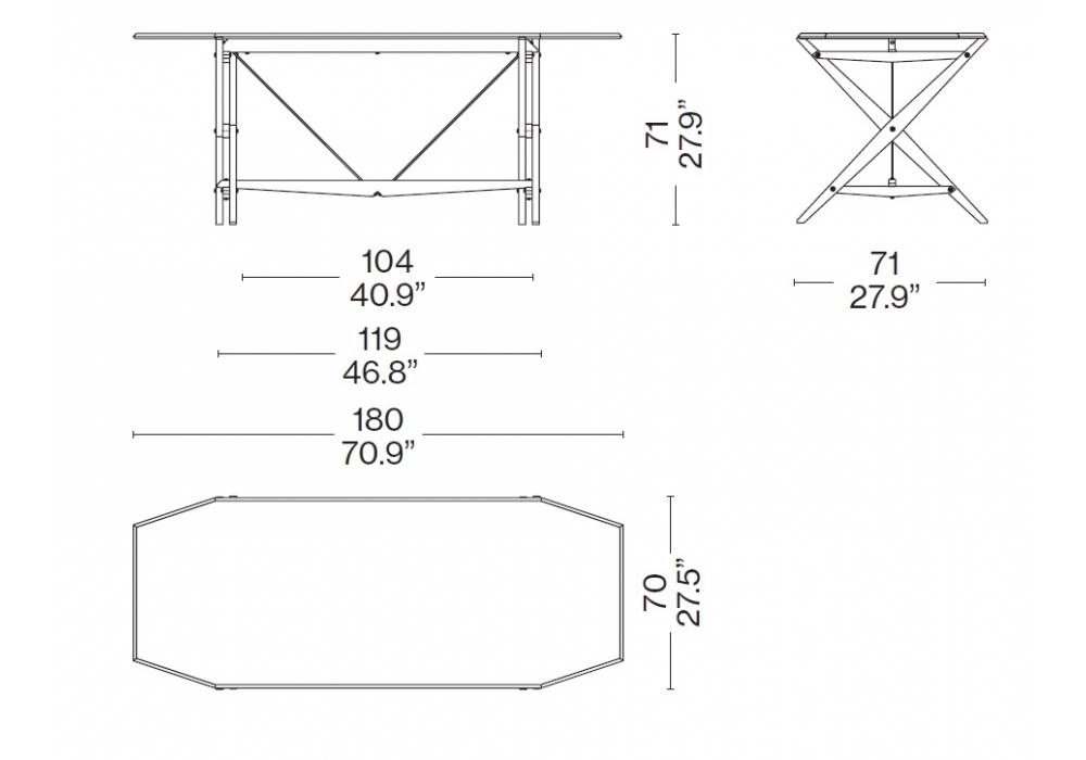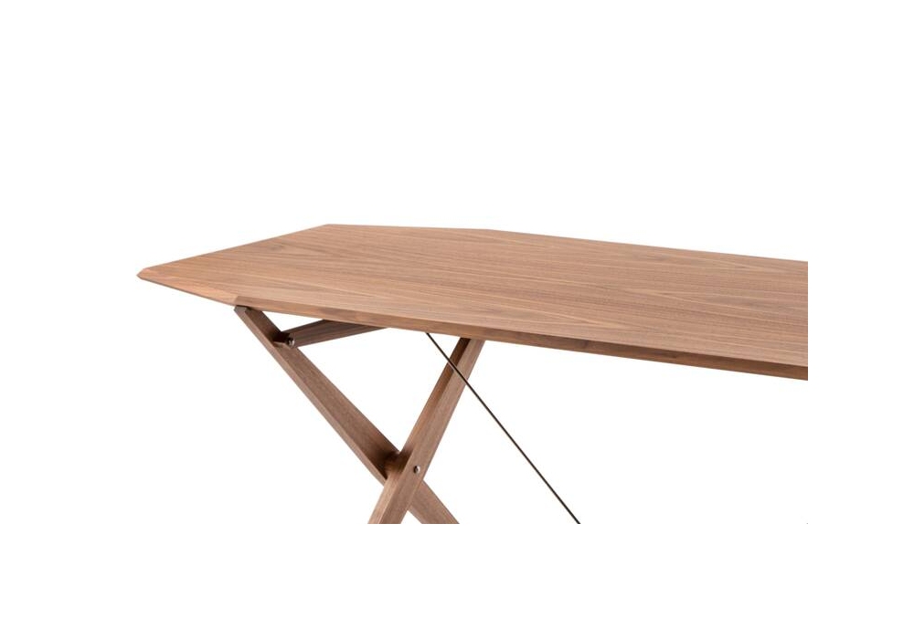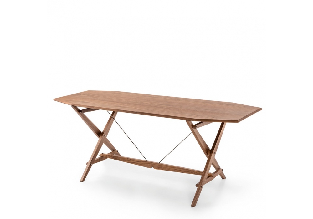 833 Cavalletto conçue par Franco Albini pour Cassina est une table réalisée avec un plateau en aggloméré, des bords en frêne massif ou en noyer Canaletto et des parties métalliques visibles en laiton bruni noir.