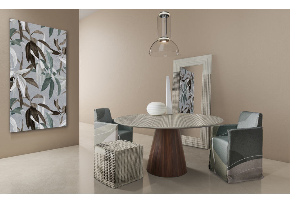 Watson conçue par Momenti Lab pour Momenti est une table avec des plateaux ronds en mdf, avec un revêtement de surface appliqué à la main, une impression d'art et une finition protectrice mate non toxique ou avec une impression d'art avec une finition brillante brillante. Face inférieure et bords laqués. Pieds coniques en bois laqué ou en bois teinté noyer. Y compris le matériel pour la fixation sur le dessus. Disponible en différentes tailles.