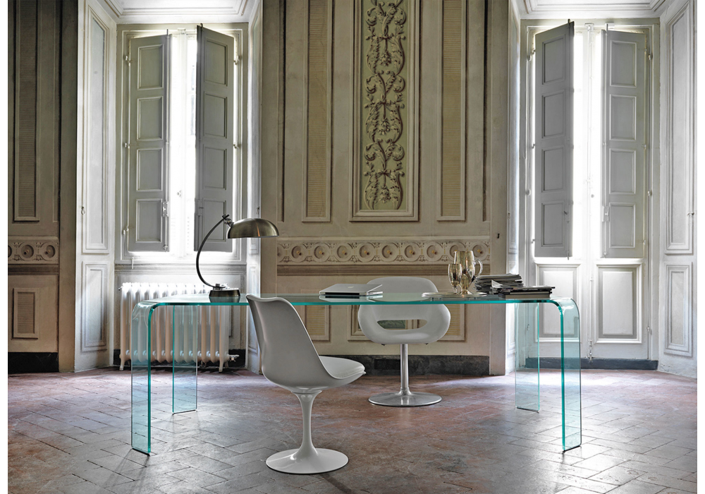 Ragno conçue par Vittorio Livi pour Fiam est une table monolithique en verre courbé de 15 mm d'épaisseur, finition transparente ou extralight.