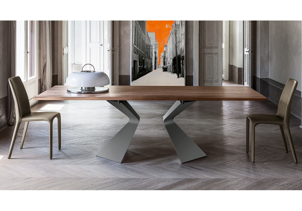 Prora conçue par Mauro Lipparini pour Bonaldo est une table rectangulaire avec plateau en différents matériaux et couleurs. La base est en métal peint mat, en différentes finitions. Disponible en différentes tailles.