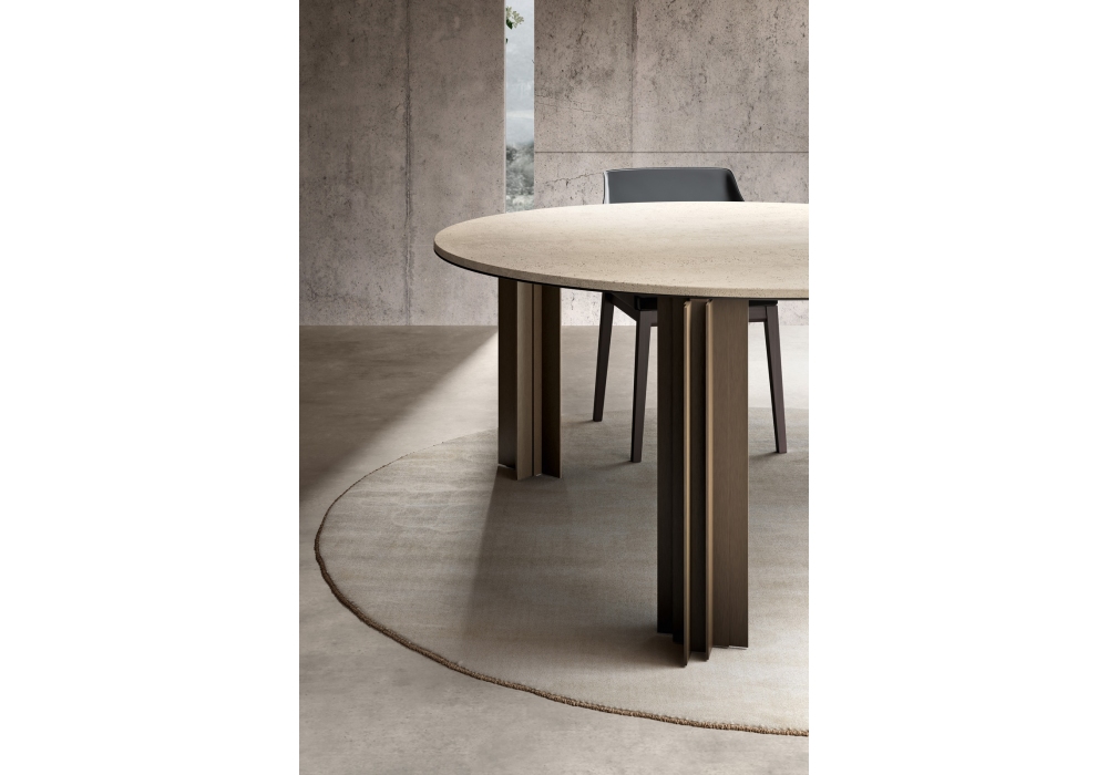 Serge conçue par Massimo Tonetto pour Venicem est une table avec structure en métal avec finition rayée bronze foncé et plateau en marbre travertin rayé à pores ouverts.
