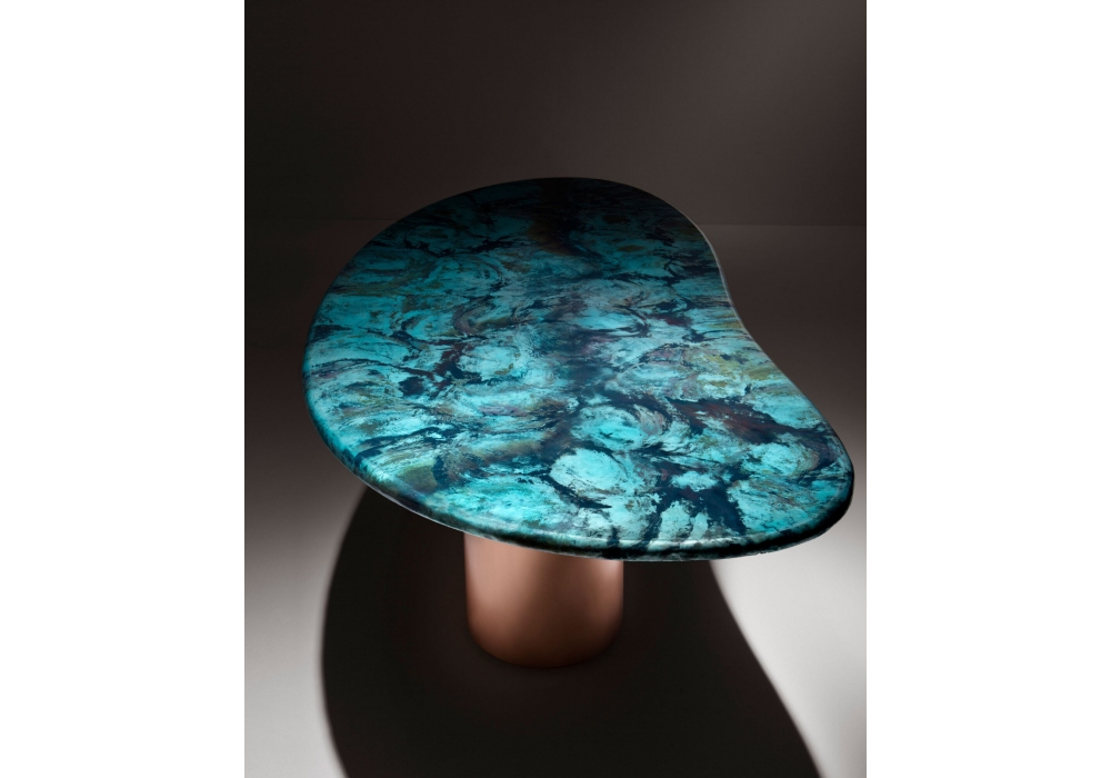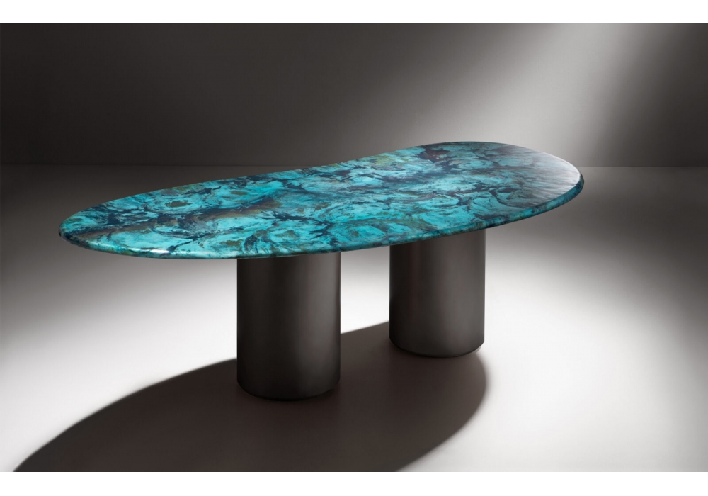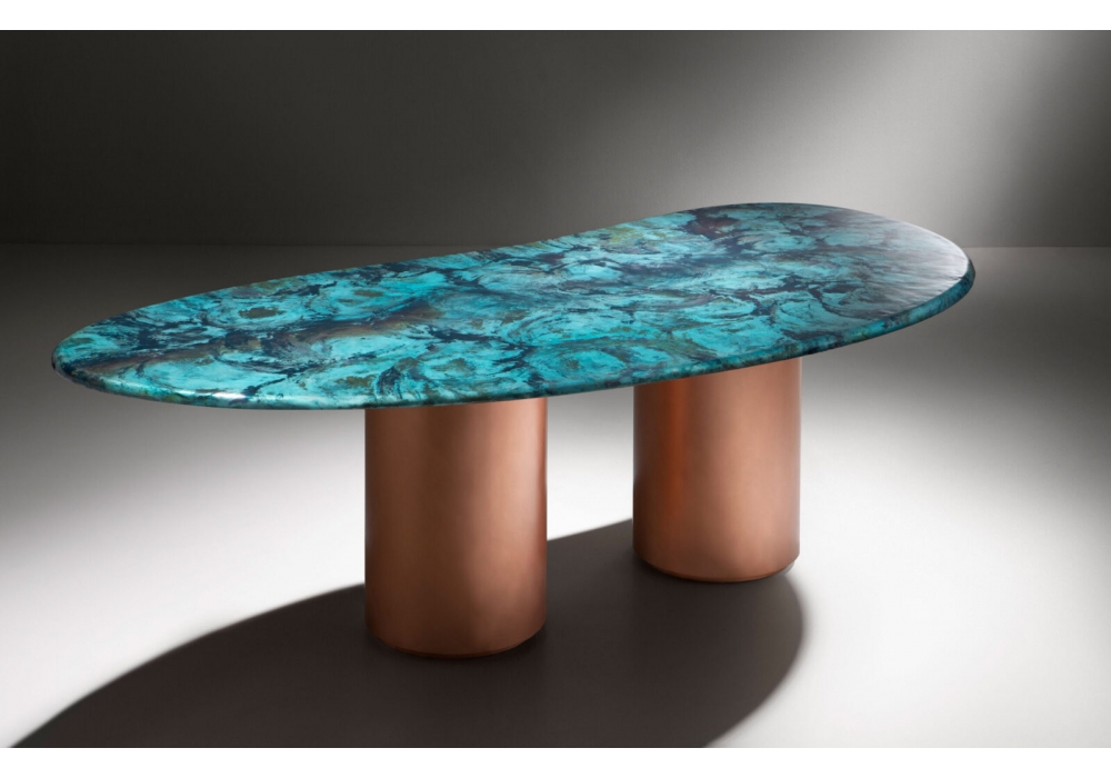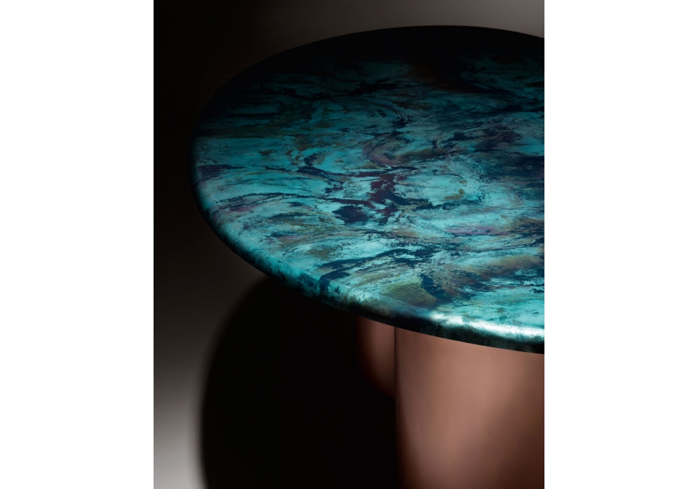 Baia conçue par Zanellato / Bortotto pour DeCastelli est une table sculpturale avec des pieds cylindriques en cuivre ou en acier inoxydable. Plateau disponible en différentes finitions.