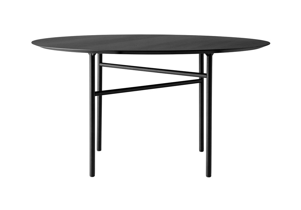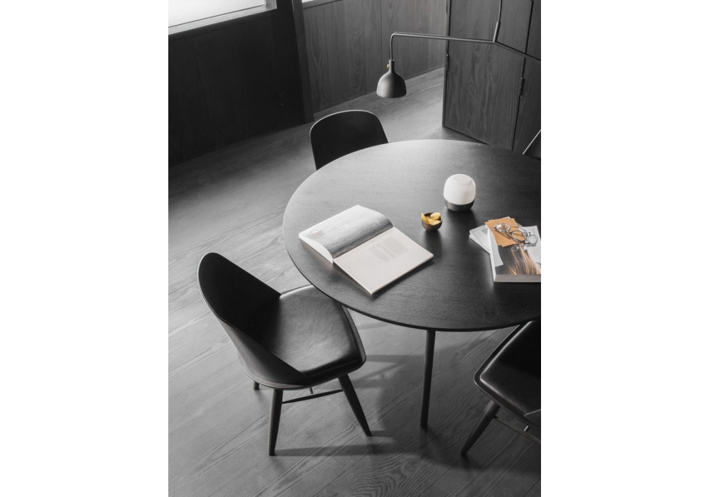 Snaregade conçue par Norm Architects pour Audo Copenhagen est une table de forme ronde avec plateau en chêne sur une base en acier inoxydable en finition noire.