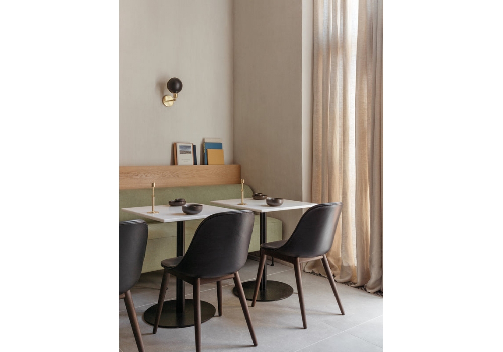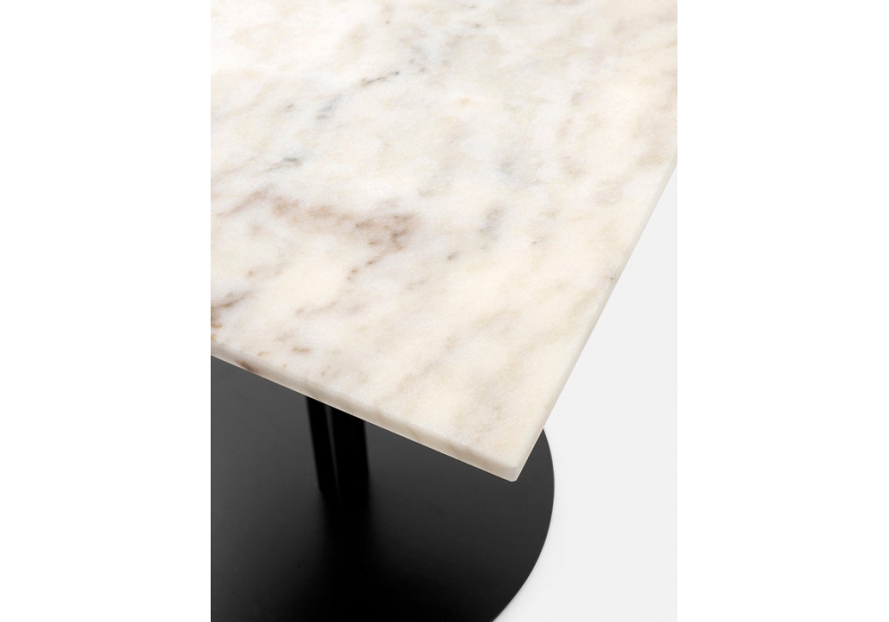 Harbour Column conçue par Norm Architects pour Audo Copenhagen est une table rectangulaire avec base en aluminium et acier enduit de poudre noire, plateau en pierre Kunis Breccia, marbre Estremoz, chêne teinté noir ou linoléum. Disponible en différentes hauteurs.