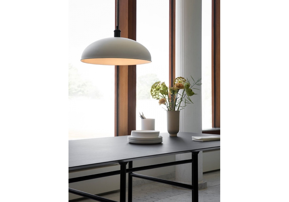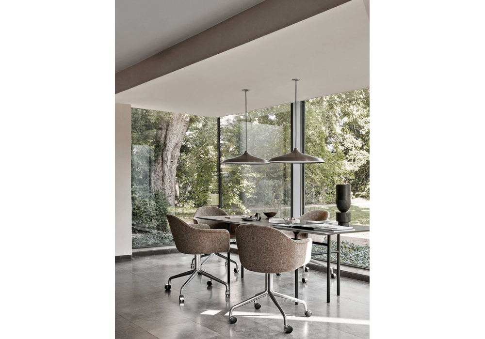 Snaregade conçue par Norm Architects pour Audo Copenhagen est une table rectangulaire avec plateau en chêne ou linoléum, pieds en acier. Disponible en différentes finitions.