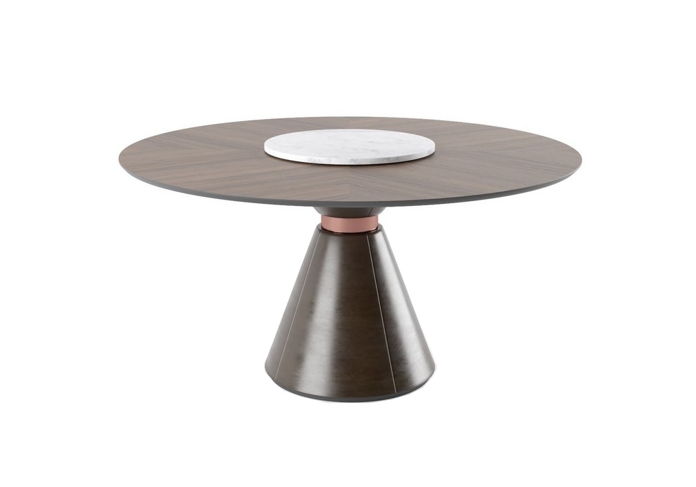 Ring conçue et produite par Gual Design est une table à manger ronde avec structure en MDF recouverte de cuir, avec anneau en acier inoxydable couleur cuivre. Plateau en placage de noyer, d'eucalyptus, d'ébène ou de chêne. Il est possible d'ajouter la version avec un plateau tournant en marbre blanc. Disponible en différentes finitions et versions.