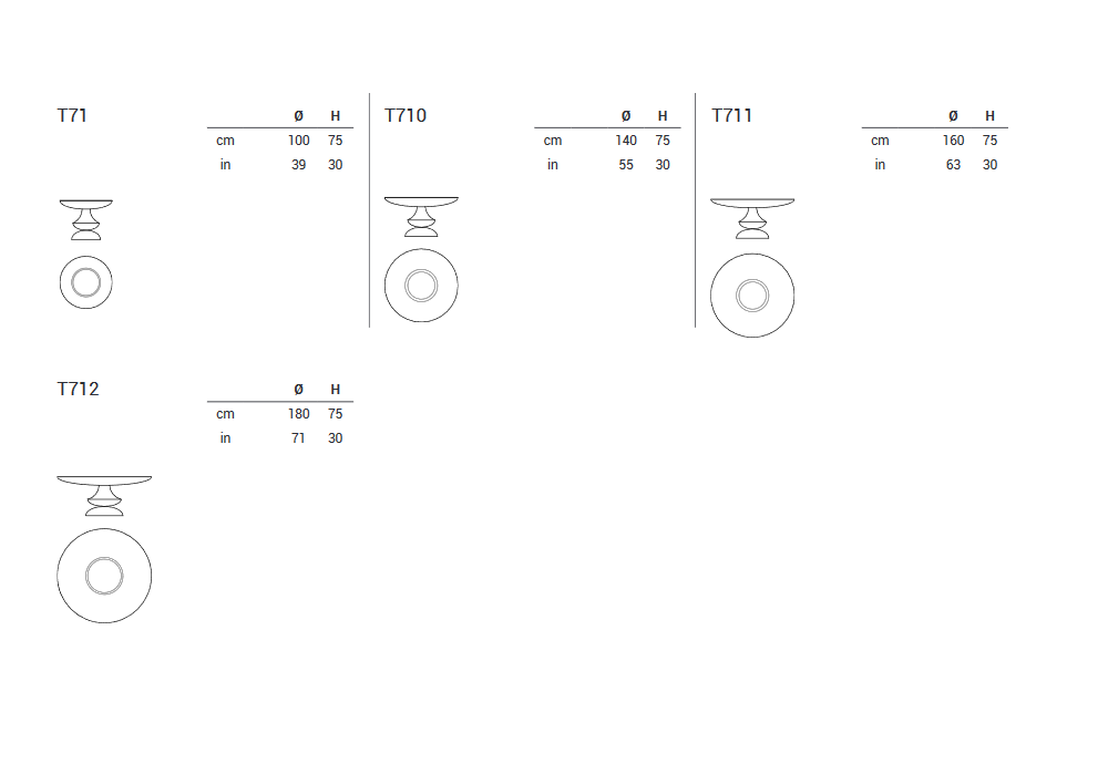 | Dimensions | - Ø 100 x H 75 cm; - Ø 140 x H 75 cm; - Ø 160 x H 75 cm; - Ø 180 x H 75 cm. |