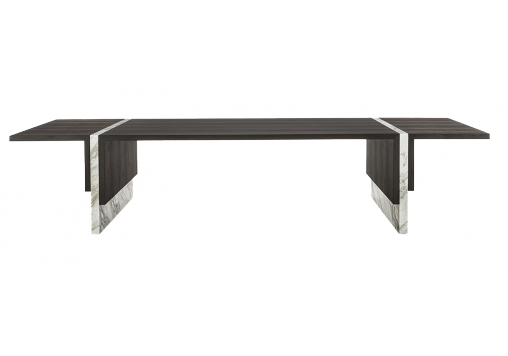 Cosmo conçue par Elena Pancaldi pour Emmemobili est une table réalisée en contreplaqué plaqué ou combiné avec des dalles de marbre. Disponible en trois tailles et en différentes finitions.