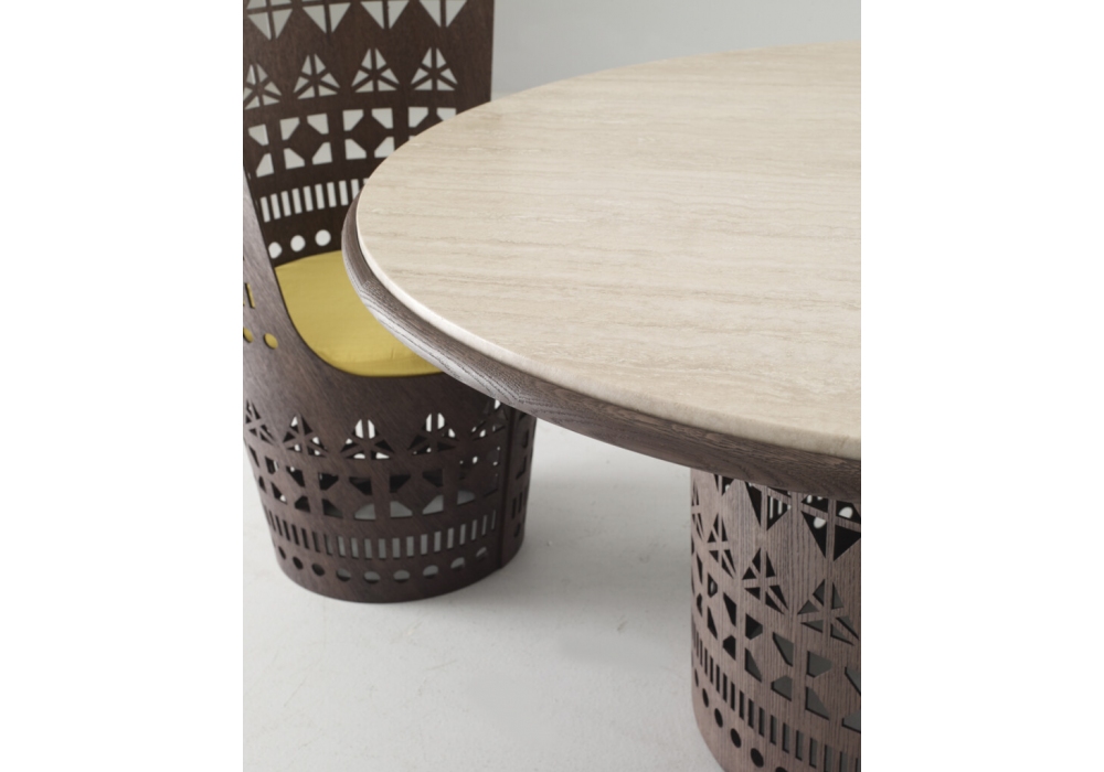 Dogon T conçue par Ferruccio Laviani pour Emmemobili est une table ronde ou ovale caractérisée par une base perforée, constituée d'une seule feuille flexible de contreplaqué plaqué. Plateaux disponibles en marbre ou contreplaqué plaqué, réalisés avec un plan de travail structurel en contreplaqué avec un bord arrondi en chêne massif. Disponible en différentes tailles et en différentes finitions.