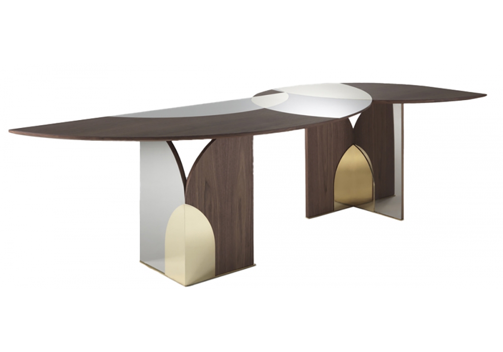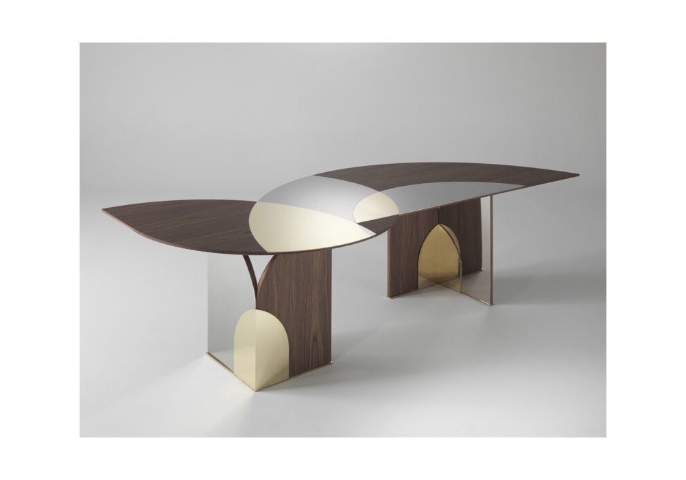 Selene conçue par Emmemobili est une table en contreplaqué plaqué et décorée de stratifiés de laiton et d'acier brillants. Disponible en deux tailles et en différentes finitions.