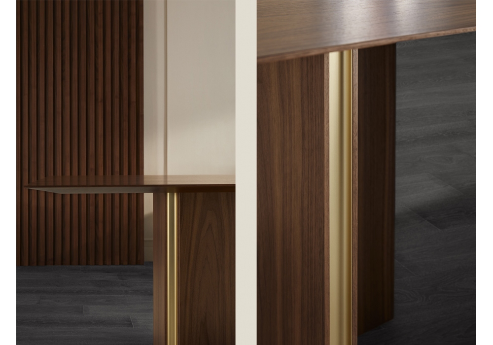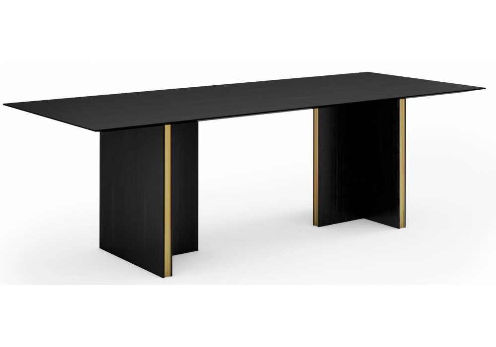 Stockholm conçue par Mario Ruiz pour Punt est une table rectangulaire avec structure en MDF plaqué noyer ou chêne avec profils en aluminium anodisé et plateau en bois ou céramique Dekton. Disponible en différentes finitions et dimensions.