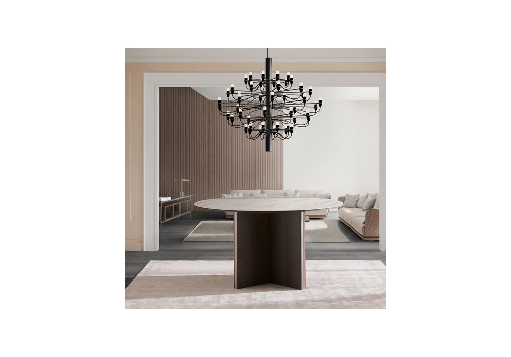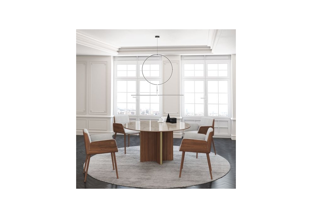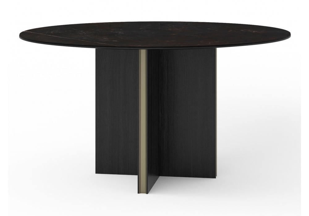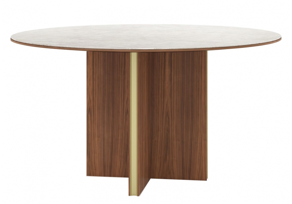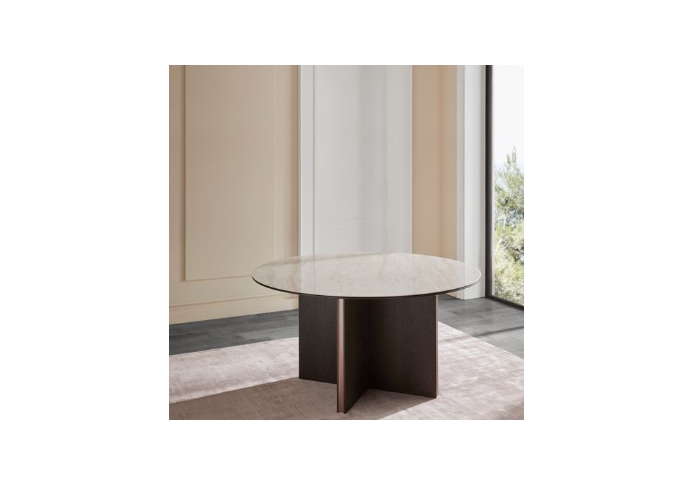Stockholm Round conçue par Mario Ruiz pour Punt est une table ronde avec structure en MDF plaqué noyer ou chêne avec inserts en aluminium anodisé et plateau en bois ou céramique Dekton. Disponible en différentes finitions et dimensions.