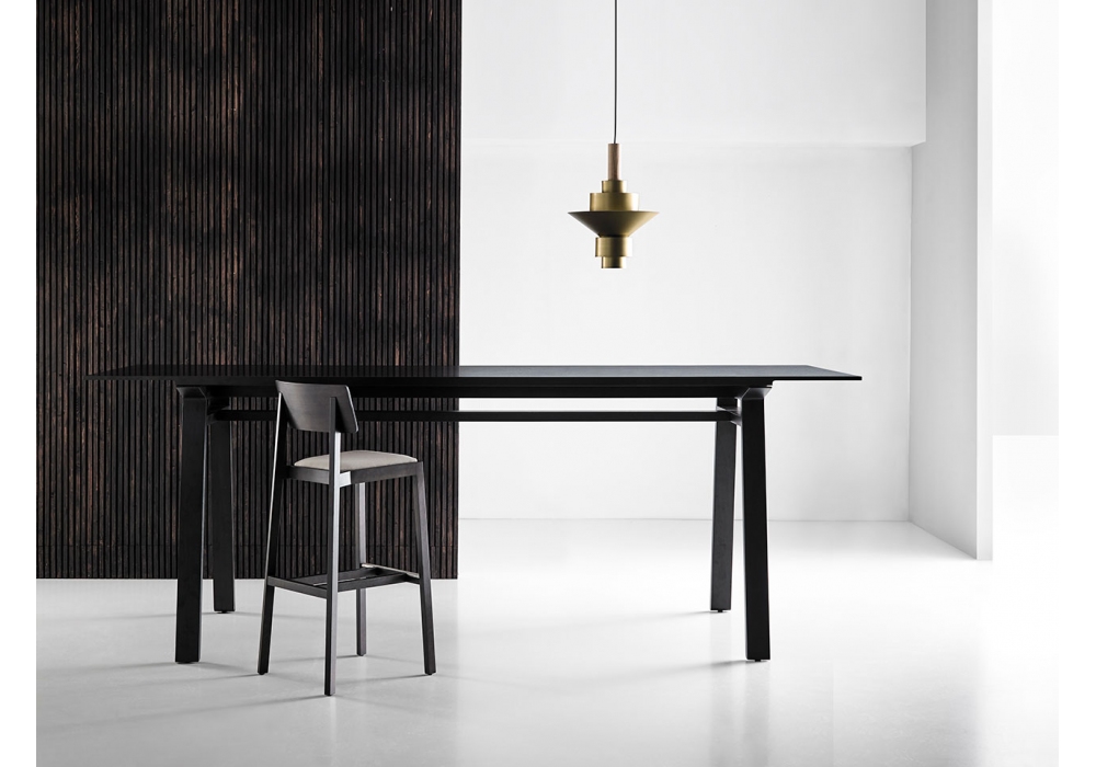 Mitis High conçue par Mario Ruiz pour Punt est une table haute avec structure en MDF plaqué noyer ou chêne et plateau en bois ou verre fumé.