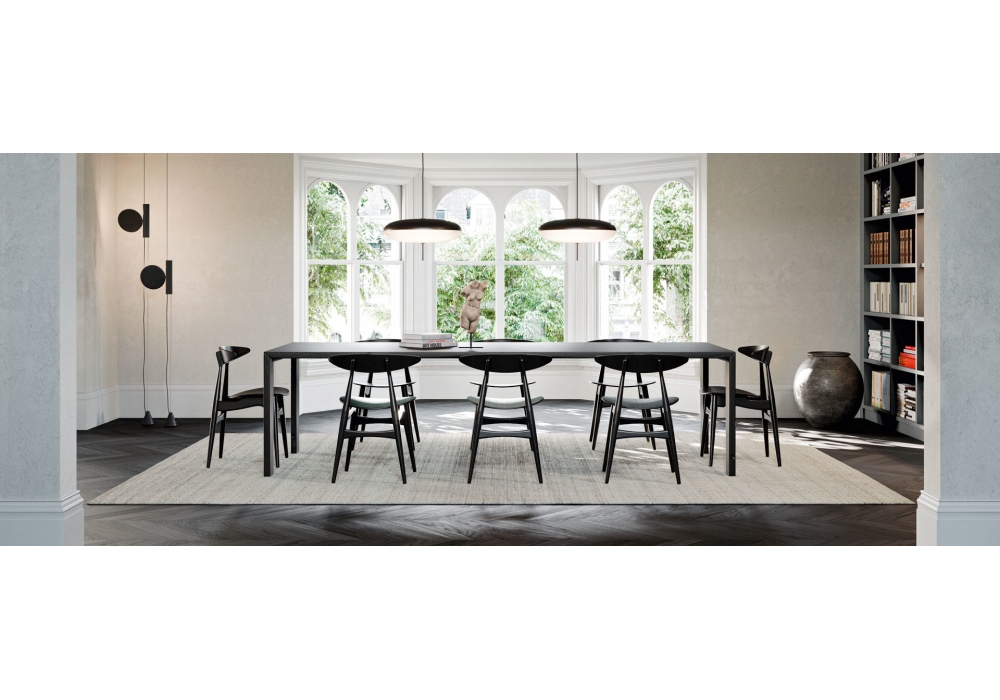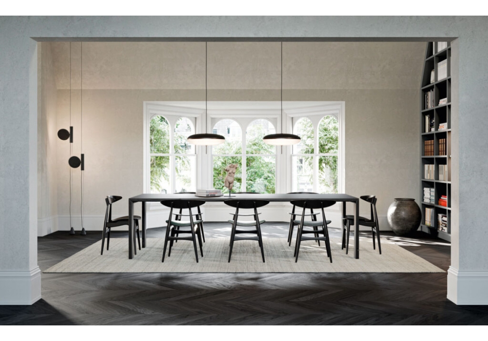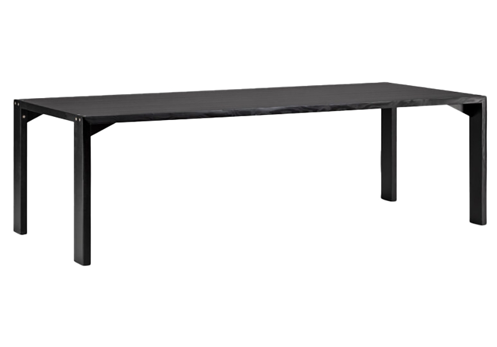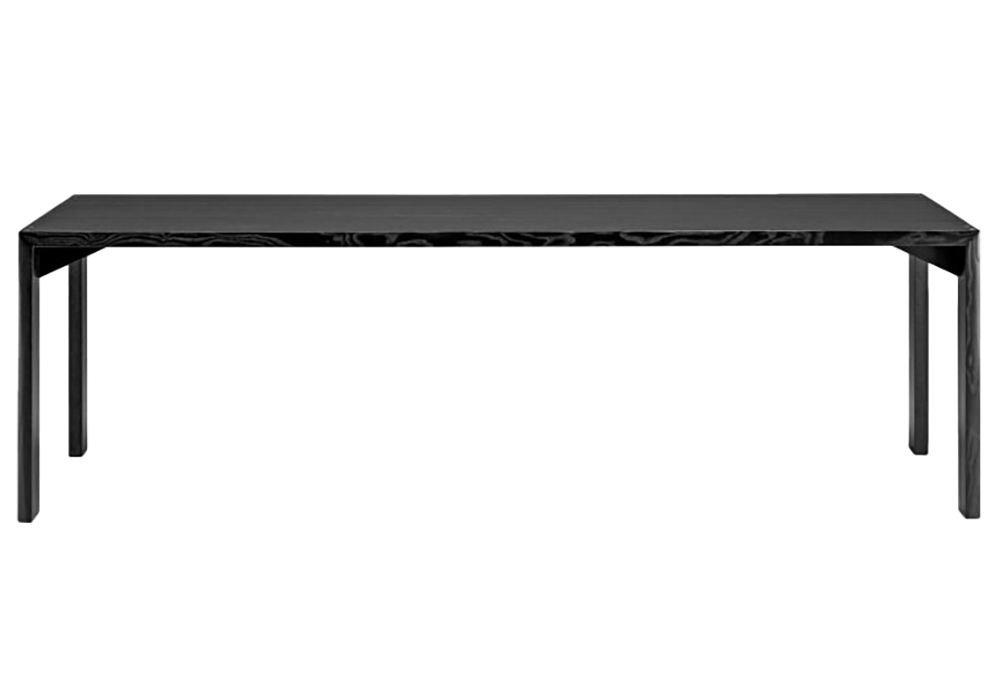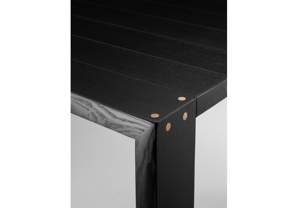 One Light conçue par L' Ottocento est une table en frêne massif réalisée avec des planches de frêne de 4 cm d'épaisseur tandis que la planche utilisée pour les pieds et pour le côté long du plateau est sélectionnée de sorte que le bord visible soit celui d'origine du tronc . Entièrement en bois massif et de couleur noire à pores ouverts, il peut être personnalisé en longueur et en couleur.
