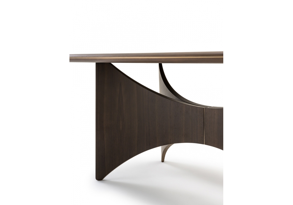 Blues conçue par Giuseppe Viganò pour Turri est une table avec structure en panneau de particules courbé plaqué noyer ou MDF en finition laquée polyester brillante unicolore. Plateau plaqué noyer ou marbre.