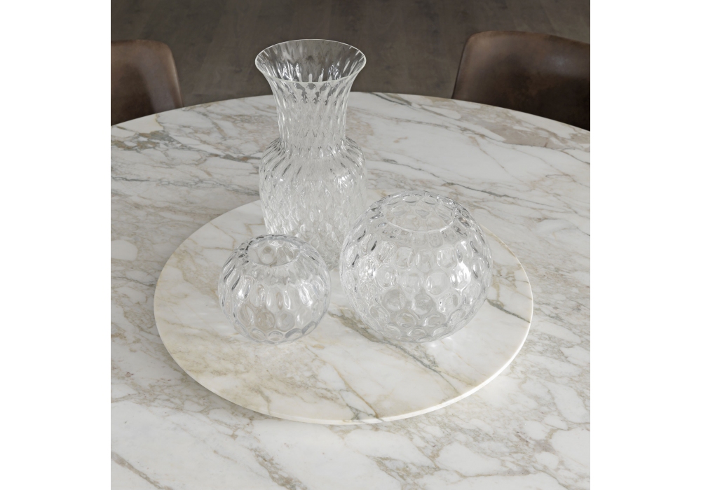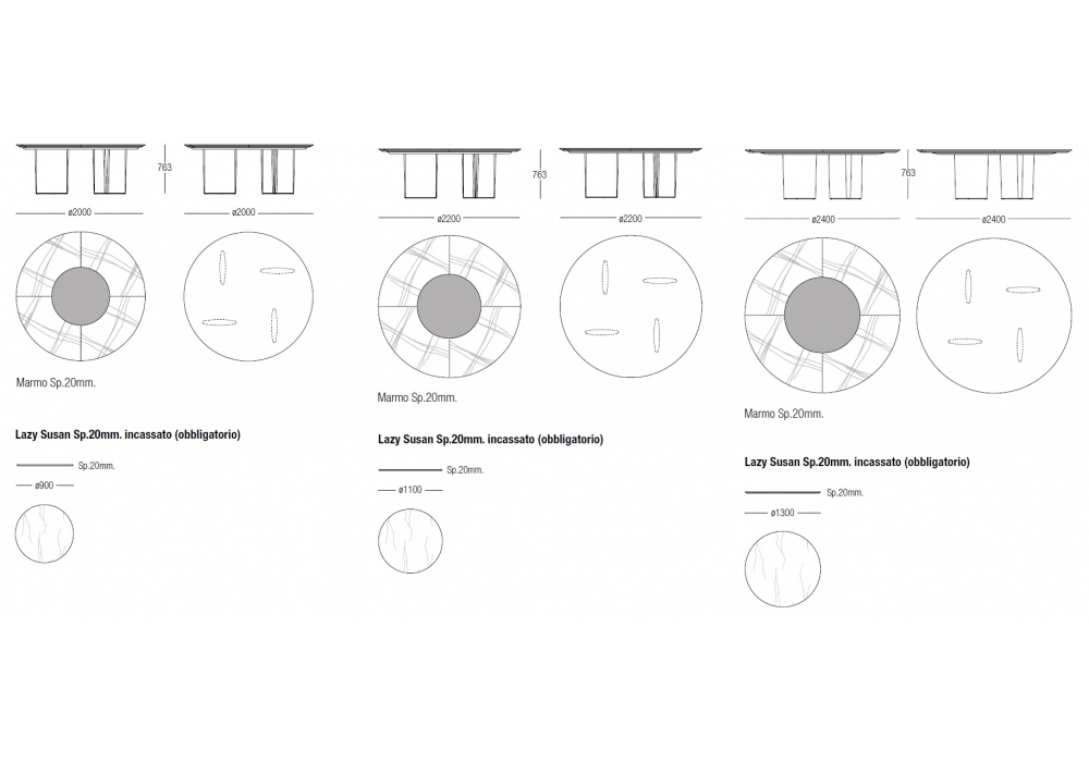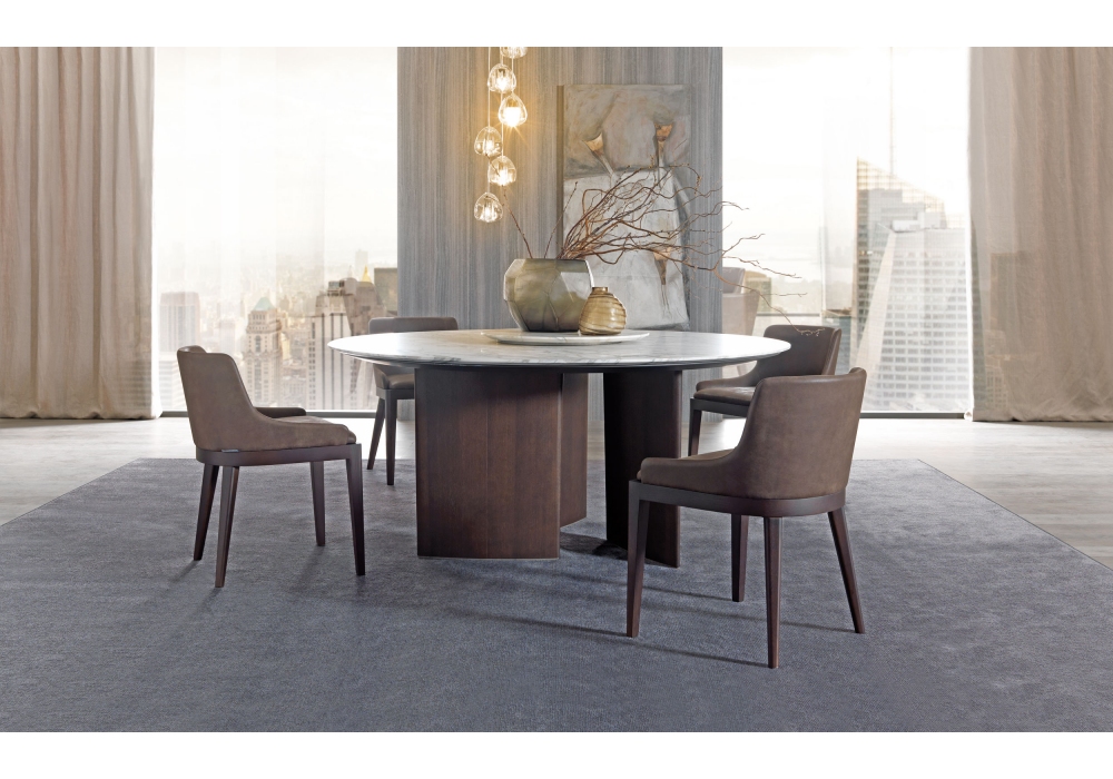 Ala Round conçue par Ferruccio Laviani pour MisuraEmme est une série de tables avec base en bois en essence, laqué mat ou laqué mat vieilli. Dessus de forme ronde en marbre avec dessous laqué. Pour le plateau rond de 155 cm et 165 cm de diamètre, il y a l'option d'un plateau en marbre de forme tournante (Lazy Susan) reposant sur le plateau central ; pour les autres dimensions, le plateau tournant intégré, toujours obligatoire, est en marbre, laqué mat ou laqué mat vieilli.