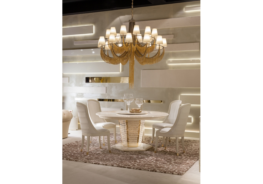 Vogue conçue par Andrea Bonini pour Turri est une table ronde avec un pied central recouvert de cuir avec l'application d'une grille en métal doré. Le plateau est en bois avec une finition laquée brillante ou marbrée. Disponible en différentes dimensions.