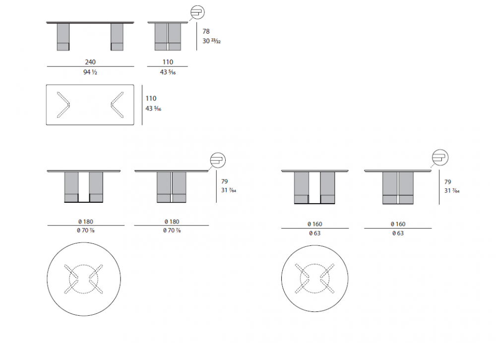 | Dimensions | 240 x 110 x H 78 cm; Ø 180 x H 79 cm; Ø 160 x H 79 cm. |