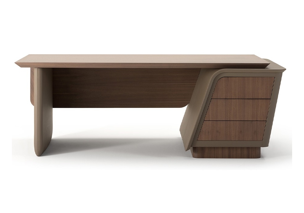 Blues conçu par Giuseppe Viganò pour Turri est un bureau avec structure en panneaux de particules plaqués en noyer et contreplaqué avec revêtement en cuir. Disponible dans la version avec commode en bois de noyer ou recouverte de cuir.