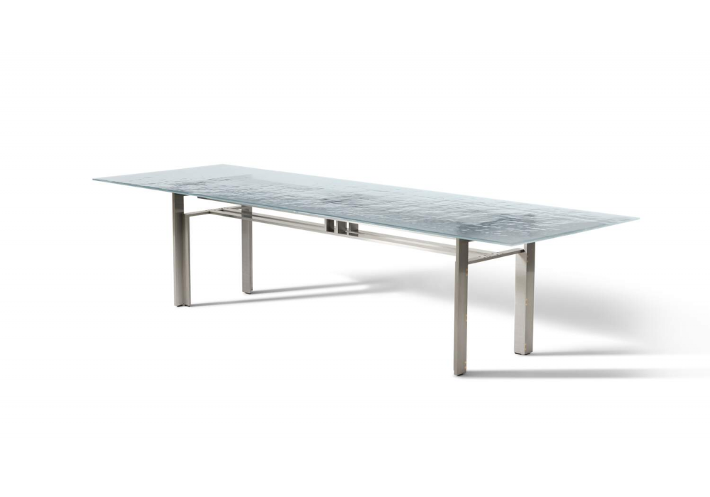 Doge Laguna conçue par Carlo Scarpa pour Cassina est une table réalisée avec structure en acier et plateau en verre extra-clair ondulé sablé.