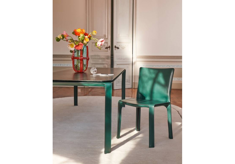 Cab Tab conçue par Mario Bellini pour Cassina est une table réalisée avec une structure en cuir dans des tons naturels, une sélection de rouges, noirs et marrons, verts et bleus et un plateau en bois ou en marbre. Disponible en différentes finitions et dimensions.
