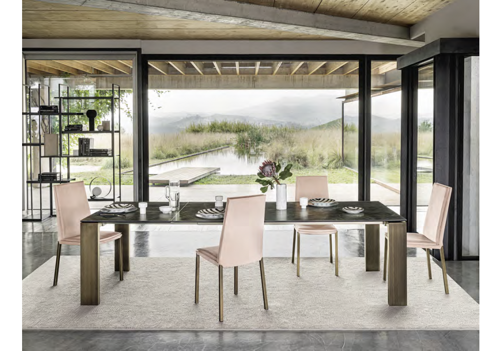 Atlantis conçue par Riflessi est une table avec structure en métal peint ou brossé à la main et plateau en céramique. Dans la version extensible, il y a un mécanisme d'extension en aluminium anodisé. Extension de livre en céramique dans la continuité du plateau, logée à l'intérieur. Disponible en différentes tailles.