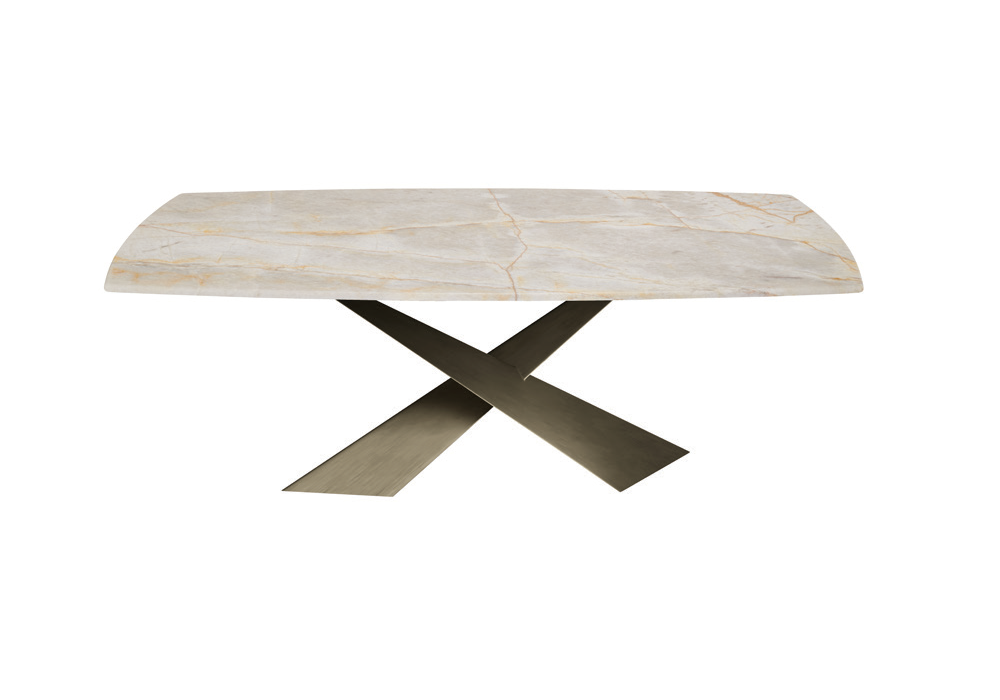 Living Marmo conçue par Riflessi est une table avec plateau en marbre et structure composée de deux pieds inclinés et superposés asymétriquement en métal peint ou brossé à la main. Les dimensions peuvent être personnalisées au cm.