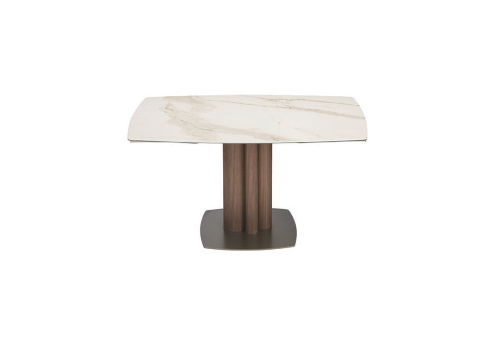 Tower conçue par Riflessi est une table avec base en métal peint ou recouverte de bois et plateau en céramique. Disponible en différentes dimensions.