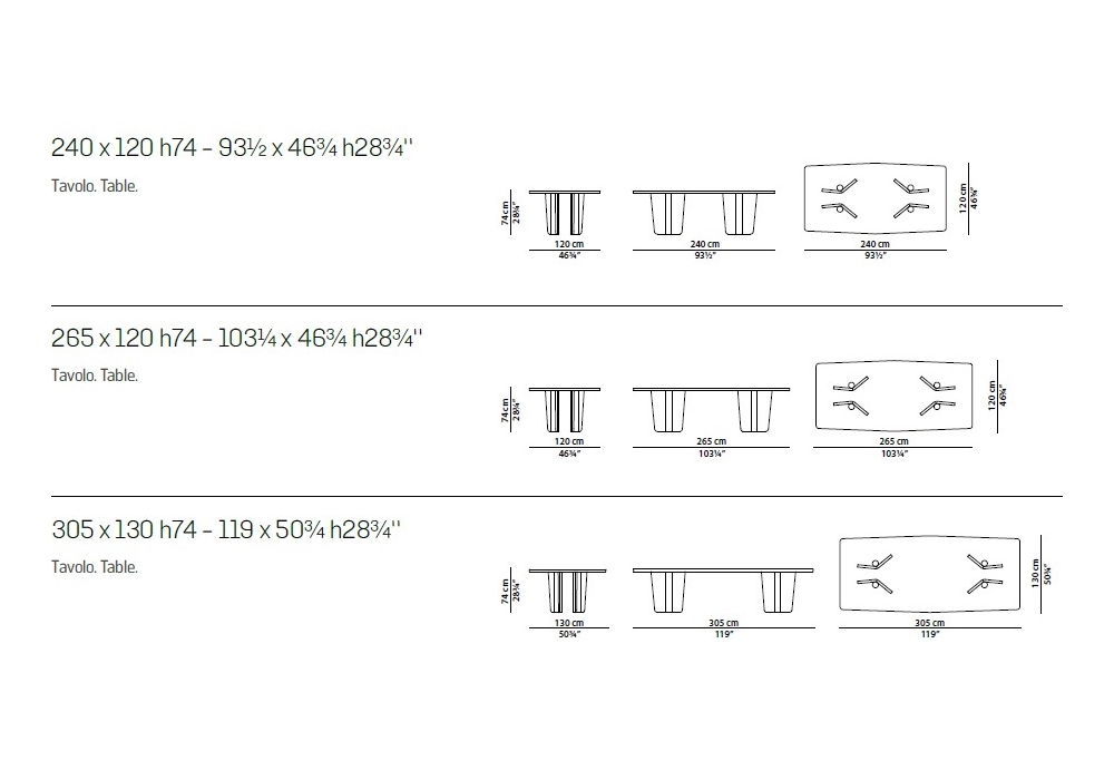 | Dimensions | 240 x 120 x H 74 cm; 265 x 120 x H 74 cm; 305 x 130 x H 74 cm. |
