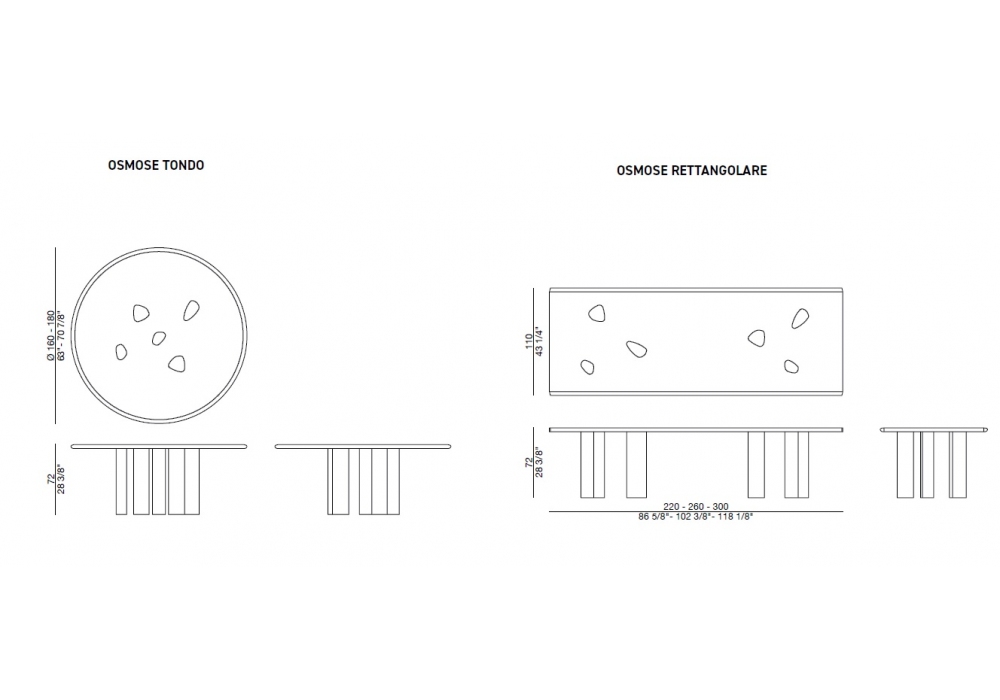 | Dimensions | Ø 160 x H 72 cm; Ø 180 x H 72 cm; 220 x 110 x H 72 cm; 260 x 110 x H 72 cm; 300 x 110 x H 72 cm. |