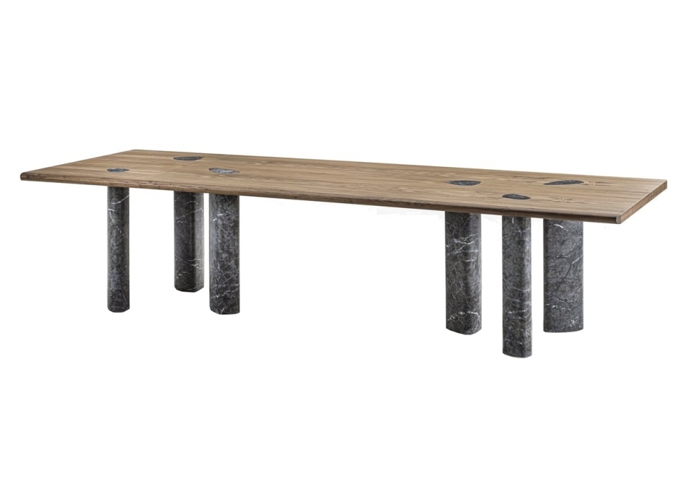 Osmose conçue par Patrick Jouin pour Porada est une table à manger avec plateau en noyer canaletta, bord façonné en bois massif et pieds en marbre. Sur le dessus, il y a des inserts en marbre dans la même finition que les pieds, en correspondance avec les pieds eux-mêmes. Disponible en différentes dimensions.