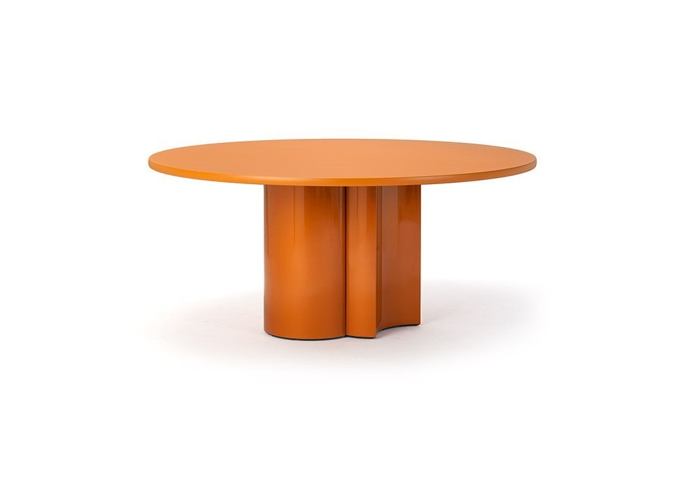 Bol conçue par Zaven pour Zanotta est une table avec des bases en polyuréthane rigide laqué mat couleur talc, caramel et algues ou laqué brillant en talc, caramel métallique et algues métalliques combinés avec des plateaux en MDF dans les mêmes couleurs laquées mates.