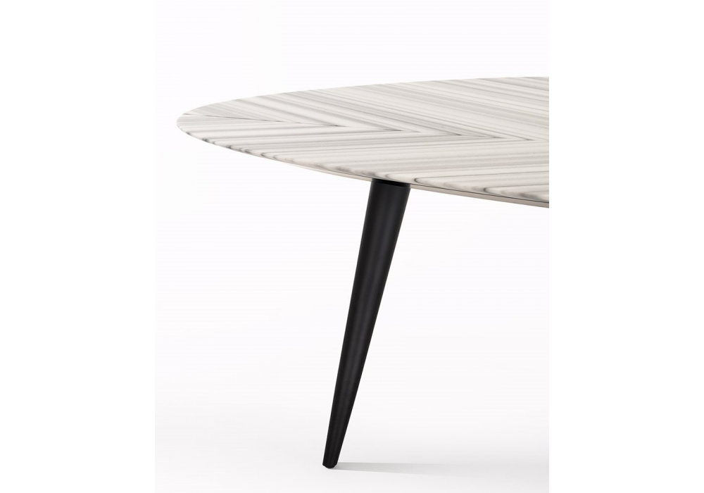 Tweed Marble conçue par Garcia Cumini pour Zanotta est une table avec plateau en marbre Striato Olimpico avec vernis protecteur anti-taches en polyester transparent opaque. Dessous de plateau en MDF laqué noir mat. Pieds en tube d'acier peint en noir mat.