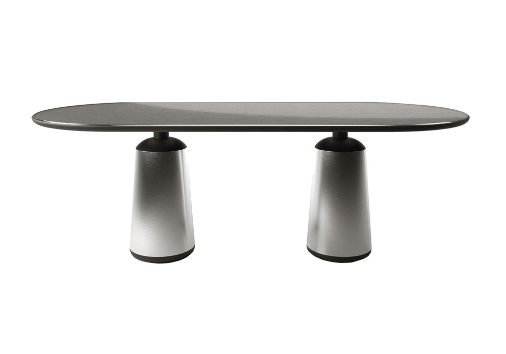 Marien Ovale conçue par Marco Piva pour Casamania & Horm est une table qui réunit une base imposante, un cône tronqué avec des finitions transversales, avec un plateau en verre noir brillant. Le verre est parfaitement maintenu dans sa base, permettant un fin bord périmétrique pour émerger.