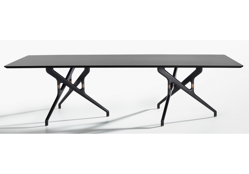 Torso Rectangular conçue par Gianluigi Landoni pour Potocco est une table rectangulaire structurée par la combinaison de frêne massif ou de noyer américain en différentes finitions avec des décorations en laiton bruni. Le plateau est de forme rectangulaire disponible en différentes finitions de bois.