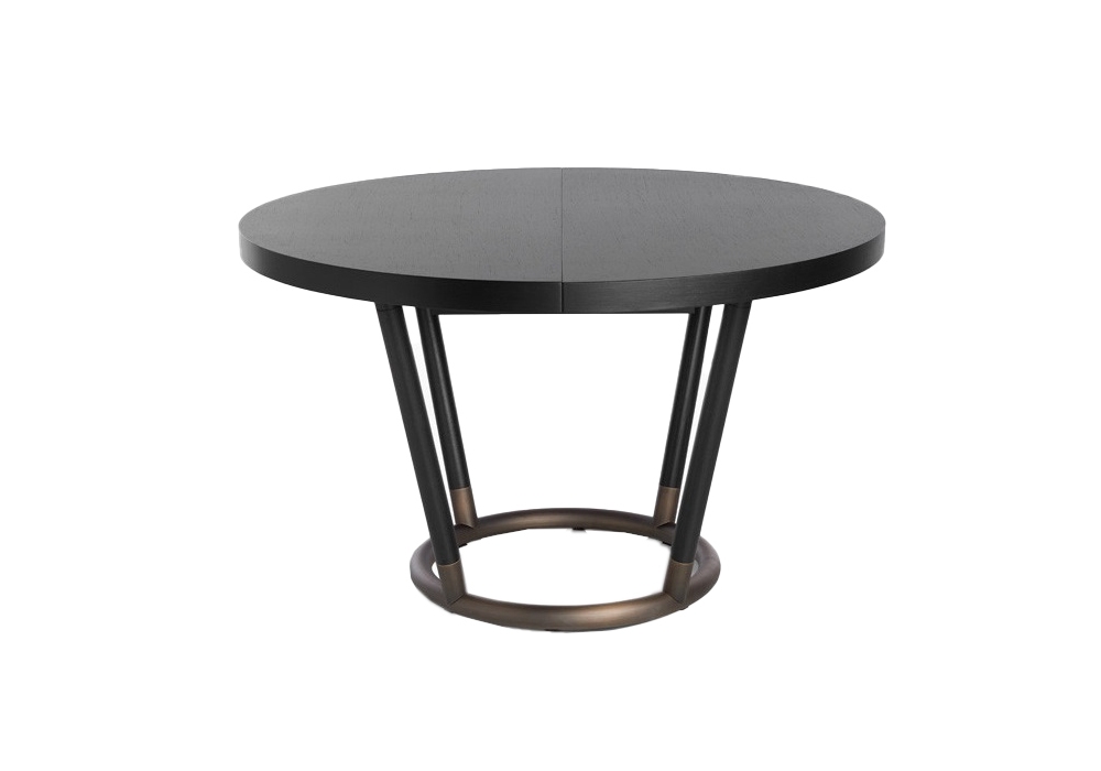 Pipe conçue par Favaretto & Partners pour Potocco est une table extensible ronde entièrement en frêne massif en différentes finitions. Base tubulaire en laiton bruni.
