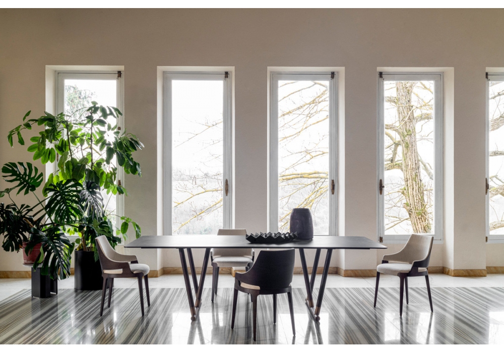 Pipe conçue par Favaretto & Partners pour Potocco est une table rectangulaire avec base à deux tréteaux inversés en frêne et métal finition laiton bruni. Le plateau est en frêne, en grès cérame de faible épaisseur ou en marbre, arrondi aux angles.