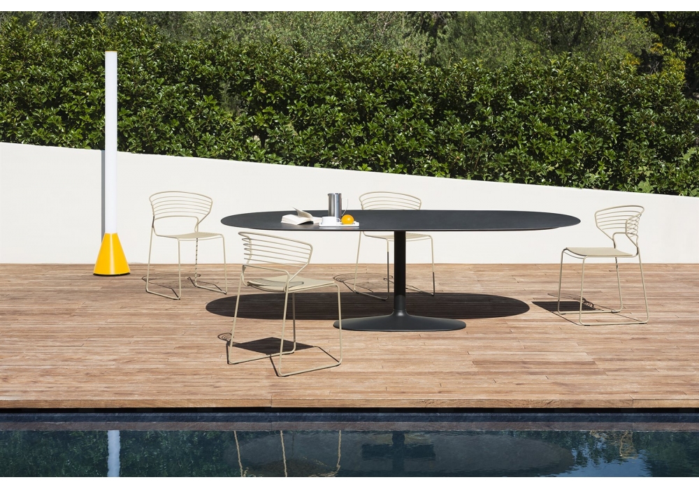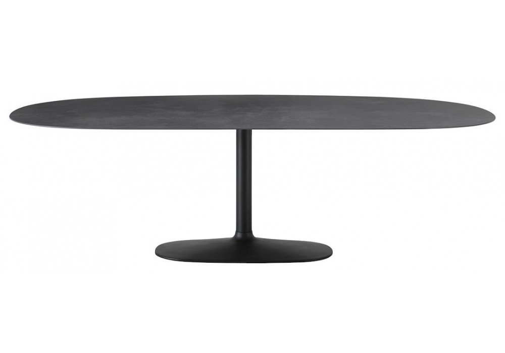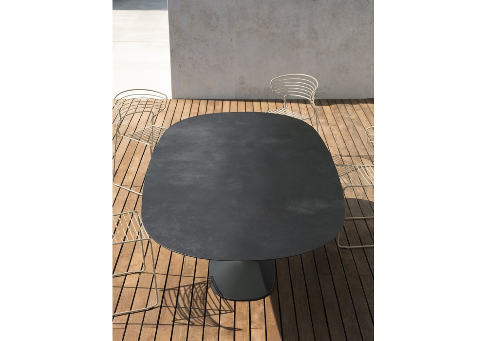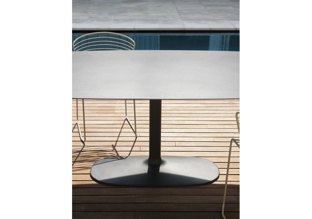 Ellis conçue par Pocci e Dondoli pour Desalto est une table avec base en fonte et tube en acier inoxydable, plateau en céramique. Disponible en différentes finitions, tailles et en version extérieure.