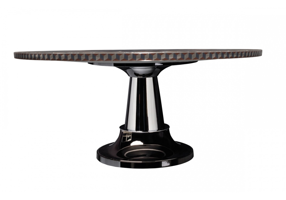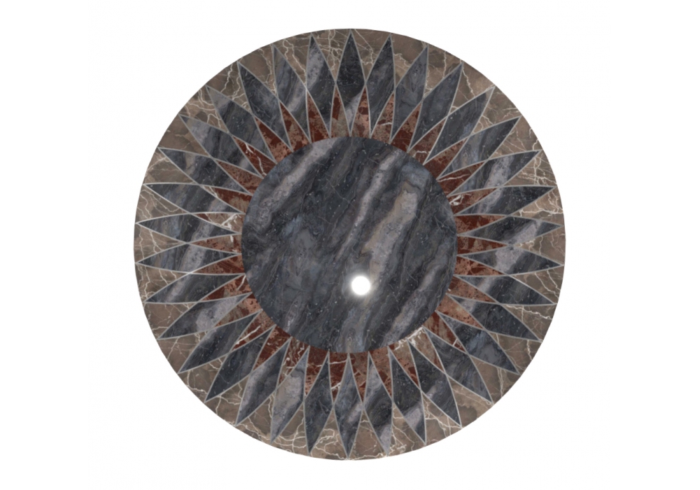 Raidho conçue par Steve Leung pour Visionnaire est une table avec un plateau circulaire en marbre incrusté avec une pièce maîtresse en marbre ou en pierre en option. La base est en métal circulaire. Raidho est disponible en différentes finitions et modèles.