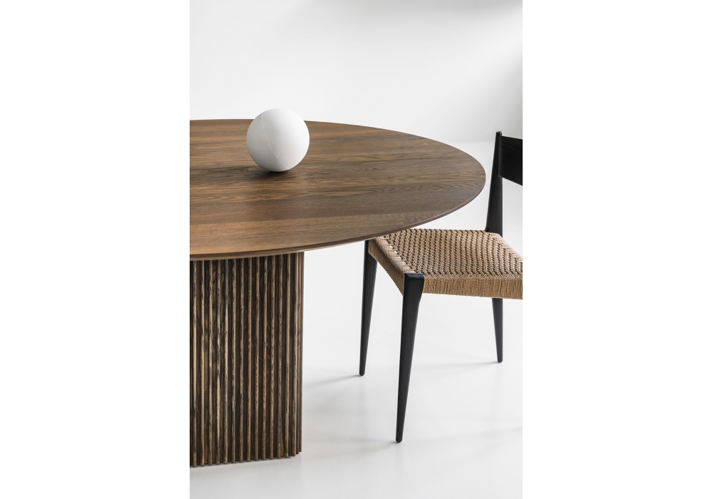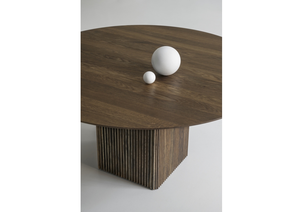 Ten conçue par Christian Troels & Jacob Plejdrup pour Dk3 est une table ronde en bois massif, disponible en différentes finitions et tailles, l'ajout d'extensions est également disponible.