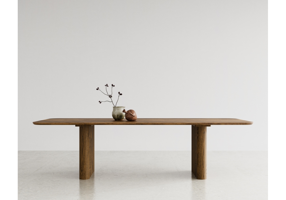 Plush conçue par Jacob Plejdrup pour Dk3 est une table rectangulaire en bois massif. Disponible en différentes finitions et tailles, l'ajout d'extensions est également disponible.