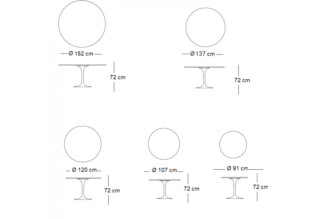 | Dimensions | Ø 152 x H 72 cm; Ø 137 x H 72 cm, Ø 120 x H 72 cm; Ø 107 x H 72 cm; Ø 91 x H 72 cm. |
